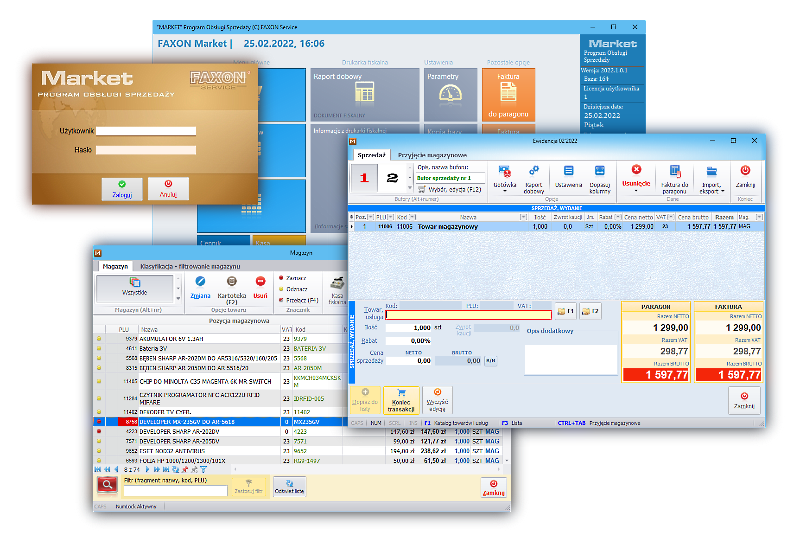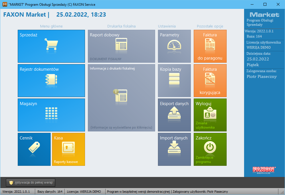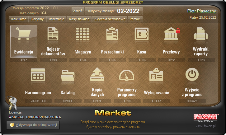 hasło (po instalacji jest ono puste - wystarczy nacisnąć Enter) i potwierdzić przez naciśnięcie kolejny raz klawisza Enterlub kliknięcie w przycisk Zaloguj. UWAGA: jeśli jedynemu użytkownikowi programu odebrane zostanie uprawnienie pełne, to nie będzie możliwy ponowny dostęp do listy użytkowników lub parametrów programu. Zmiana uprawnień powinna nastąpić dopiero po wprowadzeniu kolejnych osób tak, aby przynajmniej jedna z nich miała pełny dostęp do programu.  PARAMETRY TECHNICZNE URUCHOMIENIA (wskazówki dla informatyków): Program pracuje w oparciu o bazy danych SQL Firebird. Dostęp do bazy danych zdefiniowany jest w pliku konfiguracyjnym server.set znajdującym się w lokalizacji pliku market.exe (zwykle jest to: c:\faxon\market\server.set). Przykładowa zawartość tego pliku, przy założeniu, że dostęp do baz jest sieciowy, a serwer ma adres 192.168.207.1: [FX_MAIN] 192.168.207.1:c:\bazy\ [FXBAZA] 192.168.207.1:c:\bazy\ [FXCONFIG] 192.168.207.1:c:\bazy\ [FXPRINT] 192.168.207.1:c:\bazy\  Sposób zapisu ścieżki dostępu jest standardowy w połączeniach lokalnych. Dla połączeń sieciowych konieczny jest dwukropek po adresie IP i pełna ścieżka dostępu. UWAGA: miejsce położenia baz danych NIE POWINNO BYĆ UDOSTĘPNIANE. Komunikacja z bazą danych odbywa się poprzez mechanizm Client-Server motoru bazy SQL Firebird. Nie ma powodu, aby użytkownicy mieli dostęp do zasobu sieciowego inny niż poprzez aplikację FX-Market. Po prawidłowym zalogowaniu użytkownika program wyświetla okno główne:  Okno główne programu Market dla trybu pracy: Pełny  Okno główne programu Market dla trybu pracy: Terminal Ewidencja | Sprzedaż to najważniejsza (w bieżącej pracy) opcja. Służy wprowadzaniu dokumentów sprzedaży oraz przyjęć magazynowych. Sprzedaż - po zastosowaniu ekranów dotykowych - może być prowadzona bez użycia klawiatury. Pozostałe dokumenty oraz korekty już wprowadzonych dostępne są w opcji Rejestr dokumentów.  Rejestr dokumentów opcja, dzięki której dostępny jast lista wszystkich wystawionych dokumentów. Rejestr jest opcją, w której można wprowadzać dokumenty korygujące. W rejestrze dokumentów, w górnej części okna jest również dostępna zakładka "Raporty, księgowanie" - pozwalająca na eksport dokumentów do programu księgowego. Dostępne są też raporty sprzedaży  Magazyn pozwala na wgląd w stany magazynowe oraz dokonywanie korekt. Każda korekta wprowadzona poprzez opcję magazyn powoduje zapis dokumentu w Rejestrze, gdzie dokonane zmiany mogą być anulowane lub korygowane. W górnym menu dostępny jest wydruk raportu magazynowego oraz wydruk etykiet dla pozycji zaznaczonych w magazynie. Znaczniki w magazynie służą programowaniu kas fiskalnych oraz w pozostałych przypadkach identyfikacji towarów zapisanych ostatnio dokonanym dokumentem przyjęcia.  Rozrachunki efektem zapisywanych dokumentów w rejestrze jest automatycznie tworzona lista rozrachunków. Na zawartość tej ewidencji wpływ ma również rejestrowanie obrotu gotówkowego w opcji Kasa.  Kasa każdy zapis w opcji sprzedaży zakończony wpisaniem kwoty przyjętej gotówki powoduje automatyczny zapis dokumentu kasowego KP (kasa przyjmie). Stanowiska kasowe przypisane są do użytkownika i na tej podstawie tworzone raporty kasowe. Wydruki, raporty na podstawie zgromadzonych danych opcja udostępnia konfigurowalne raporty zakupów, sprzedaży, wyniku finansowego, remanentów itp. Harmonogram przeznaczony dla zakładów fryzjerskich, firm obsługujących solaria, baseny. Opcja pozwala na umawianie wizyt oraz rozliczanie kart impulsowych .  Parametry programu opcja przechowuje ustawienia decydujące o zakresie wprowadzanych danych, sposobie pracy programu i ważne informacje np. identyfikujące firmę, czy ustawienia wydruku dokumentów. Katalog pozwala na bezpośredni dostęp do tzw. słowników tj. spisu danych wybieranych podczas edycji np. towarów, usług, firm itp. bez konieczności wpisywania pełnego zapisu. Dla przyspieszenia wprowadzania danych można korzystać z katalogu tj. spisu pogrupowanych tematycznie informacji. Zmiany w opcji Katalog skutkują na te już wprowadzone - stąd wszelkie modyfikacje powinny być przeprowadzane z uzasadnionych powodów. Kopia danych po wskazaniu nośnika danych program wykona pełną (nie przyrostową) kopię danych. Istotne dla niedoświadczonych użytkowników: odtworzenie z kopii spowoduje bezpowrotną utratę obecnych danych i przywrócenie do stanu zapisanego w kopii! Stąd zalecana jest szczególna ostrożność w stosowaniu tej opcji. Pomoc uruchamia przeglądarkę i wczytuje niniejszą instrukcję. Wylogowanie uruchomienie tej opcji powoduje zamknięcie otwartych okien i przełączenie programu do okna identyfikacji użytkownia - logowania. Wyjście z programu po potwierdzeniu zamiaru zakończenia pracy program odłącza się od bazy danych, zamyka otwarte okna i wraca do pulpitu Windows. |