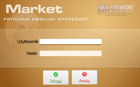 Wszelkie korekty i wprowadzanie dokumentów innych niż sprzedaż lub przyjęcie (które wprowadza się w opcji Ewidencja) dokonywane jest w opcji Rejestr dokumentów. Dane gromadzone są w okresach rocznych, tzn. Rejestr dokumentów udostępnia dane z roku, na który wskazuje data bazowa. Dostęp do danych innych lat niż rok bieżący wymaga odpowiedniego ustawienia daty bazowej (okno główne: Zmiana daty bazowej).  Każde stanowisko komputerowe, o ile pracuje w sieci, powinno mieć poprawnie skonfigurowany dostęp do wspólnej bazy danych. Podczas wdrożenia programu wymagane jest, aby program zainstalowany był na każdym stanowisku, a w miejscu, w którym znajduje się plik wykonawczy programu market.exe zawartość pliku server.set wskazywała na poprawny adres bazy. Edycja tego pliku nie jest dostępna z poziomu programu, a zasady rządzące połączeniem do bazy przedstawione są w treści tego pliku. Standardowa zawartość pliku server.set - przy pracy lokalnej (bez sieci), to np.: c:\faxon\bazy\ Przykładowa zawartość pliku przy pracy w sieci, to np.: 192.168.207.1:/fx/bazy/ W powyższym przykładzie serwer ma adres IP 192.168.207.1 i na dysku głównym znajduje się folder fx, podfolder bazy, w którym znajdują siępliki bazy danych. Do pracy konieczne są dwa pliki bazy danych: fx_main.gdb - przechowujący dokumenty i główne dane programu, fxConfig.gdb - przchowujący dane konfiguracyjne oraz informacje o użytkowniach. Po zainstalowaniu programu FX-Market na pulpicie monitora powinna być dostępna ikonka programu. W przypadku jej braku, w menu Windows Start należy wyszukać pozycję Market System Obsługi Sprzedaży i ją uruchomić. Po okienku startowym informującym o etapach uruchmieniowych wyświetlone zostaje okno identyfikacji użytkownika - okno logowania:  Okno logowania programu FX-Market W okienku tzw. logowania należy wprowadzić: