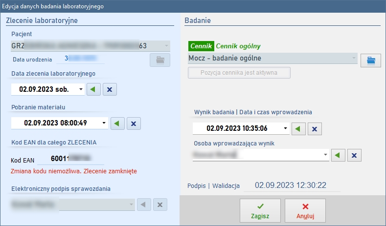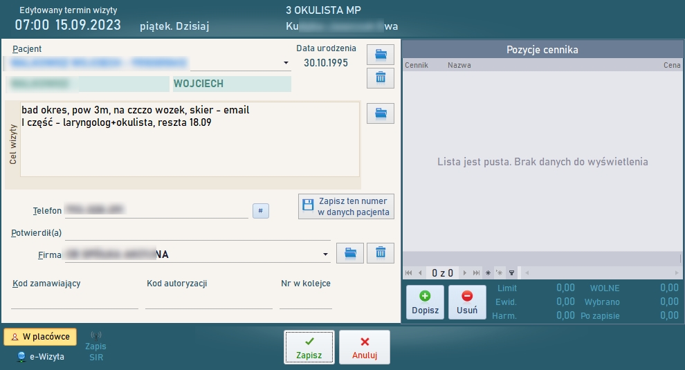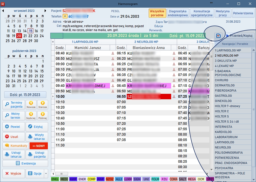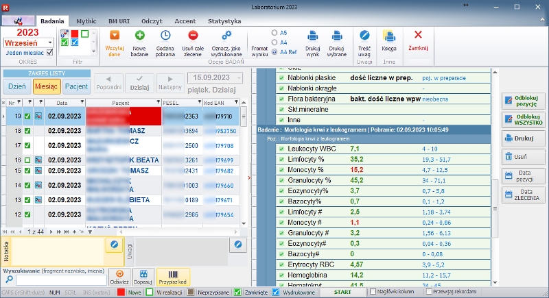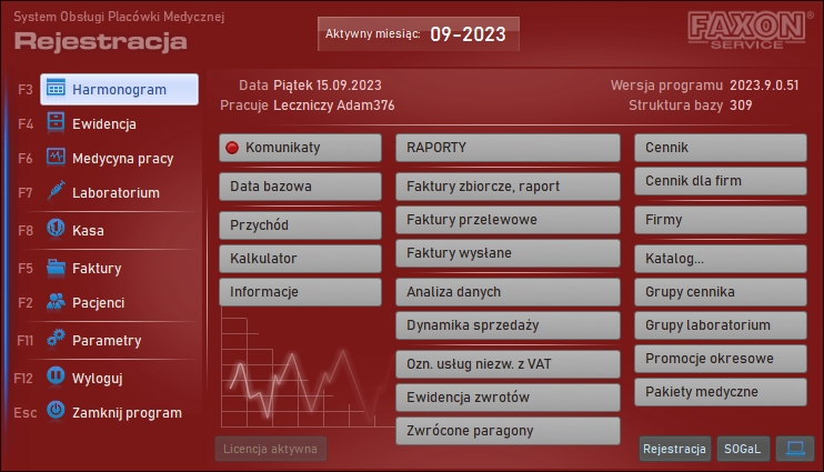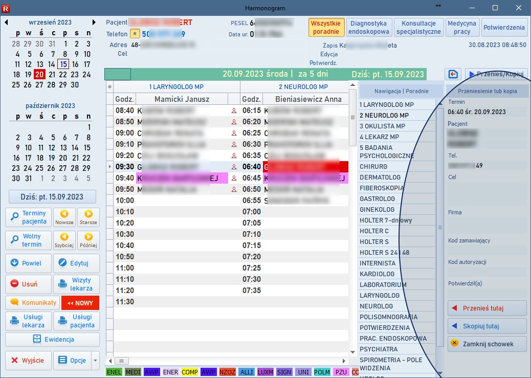Nowy interfejs graficzny obejmuje okno startowe, okno logowanie oraz okno główne programu. Pozostałe zmiany interfejsu pozostają wspólne dla wszystkich schematów. Poprzednie wersje również są dostępne po użyciu przełącznika z okna głównego. Znacząco przyspieszono uruchamianie programu dzięki optymalizacji analizy struktury bazy danych. Przełącznik w każdym z wybranych stylów interfejsu użytkownika, to ikona z piktogramem monitora (na ilustracji znajduje się w prawym dolnym narożniku okna). ![]() Okno startowe ![]() Okno główne ![]() Nowy interfejs - edycja kartoteki pacjentów ![]() Nowy interfejs - edycja ewidencji medycznej ![]() Nowy interfejs - edycja harmonogramu (Dane na ilustracjach zamazano celowo). W prawej części okna wprowadzono panel pozwalający na szybkie przełączanie do żądanej poradni. Lista tego panelu udostępnia wyłącznie te poradnie, które są dostępne w wybranym dniu. Panel może być ukryty lub przywołany po kliknięciu ikony z piktogramem czerwonej strzałki na tle folderu. ![]() Harmonogram - panel nawigacyjny Każda pozycja harmonogramu może być skopiowana do podręcznego schowka, a nastepnie przeniesiona lub skopiowana do nowego terminu. ![]() Harmonogram - kopiowanie lub przenoszenie terminów Wprowadzono liczne zmiany dotyczące edycji oraz listy wykonanych badań. Edycja wyniku dostępna jest obecnie w sposób płynny z dokładnością przewijania co do piksela, zyskując tym samym na płynności podczas wprowadzania wielu złożonych wyników badań. Okno edycyjne pakietu badań podzielone zostało na dwie części: dotyczącą całego pakietu i wybranego badania w ramach tego pakietu. ![]() Laboratorium - lista ![]() Laboratorium - edycja Szczepienia rejestrowane są w bazie danych w sposób odpowiadający wykonywanym czynnościom: