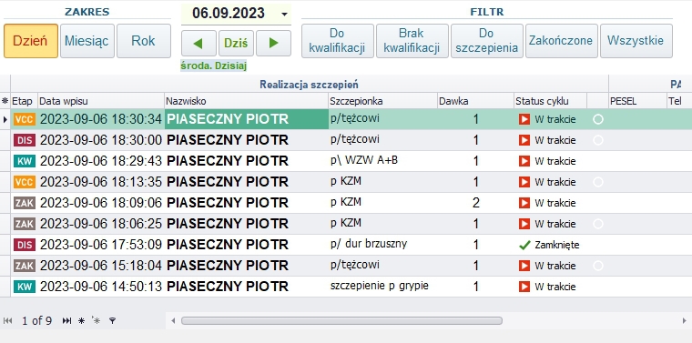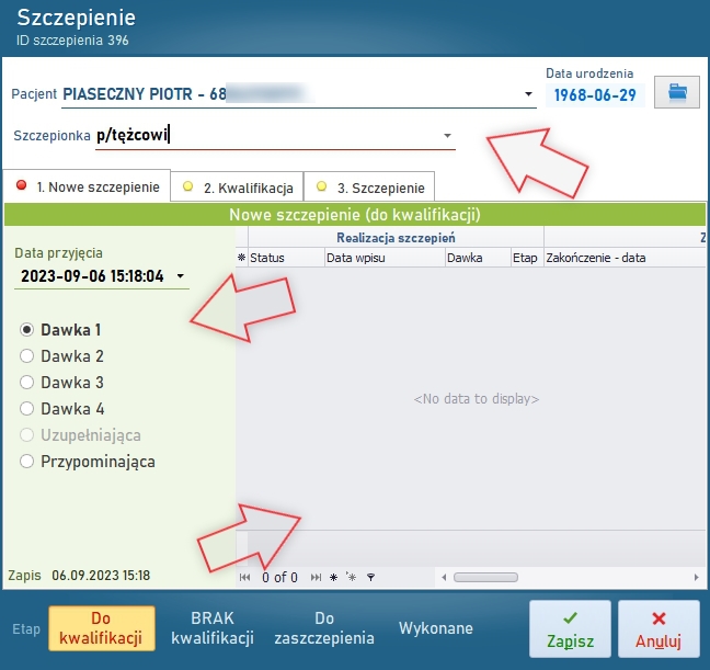 Wszystkie opisane powyżej czynności zapisywane są w JEDNYM REKORDZIE (jednej pozycji) rejestru szczepień. Do edycji w powyższym zakresie udostępniane jest jedno okno – dla każdego etapu osobna zakładka (ilustracja). ![]() Szczepienie - edycja Zakładki edycyjne szczepień: 1. Nowe szczepienie Należy wybrać z listy pacjenta, określić rodzaj szczepionki (na ilustracji górna strzałka) oraz dawkę w cyklu (na ilustracji strzałka środkowa). Lista w tej zakładce (na ilustracji pusta) wskazywana przez dolną strzałkę ma za zadanie wyświetlać wszystkie wykonane szczepienia wybranej szczepionki wskazanego pacjenta. Jeśli nigdy nie wykonywano danego szczepienia w placówce, lista jest pusta. 2. Kwalifikacja Określa wynik kwalifikacji oraz czas jej przeprowadzenia i osobę kwalifikującą. 3. Szczepienie Określa informacje o wykonywanym szczepieniu oraz kolejny etap dla szczepień realizowanych w kolejnych dawkach, o ile w danym rodzaju szczepienia występują. Etapy szczepienia – wyświetlane w ostatnim pasku okna edycyjnego („Do kwalifikacji”, „BRAK kwalifikacji”, „Do zaszczepienia”, „Wykonane”) ustawiają się zależnie od wprowadzonych danych. Można również nimi zmienić etap na kolejny, ale nie ma szczególnych powodów, żeby miałaby to być funkcjonalność ułatwiająca – zwyczajnie należy kolejno rejestrować faktycznie wykonywane czynności, w opisanym powyżej cyklu. WAŻNE| Jeśli w bazie zostanie zarejestrowane szczepienie, którego etap będzie inny, niż „Wykonane” lub „Brak kwalifikacji” , to program nie pozwoli na zarejestrowanie nowego szczepienia tej samej szczepionki. Najpierw należy zakończyć rozpoczęty. WAŻNE| Jeśli w bazie zostanie zarejestrowane szczepienie, które przewiduje kolejne dawki do wykonania w późniejszym czasie, a status będzie ustawiony na „Cykl szczepień będzie kontynuowany”, to program nie pozwoli na zarejestrowanie innej dawki, niż ta wskazywana w poprzednim szczepieniu. Jeśli z różnych przyczyn szczepienie ma rozpocząć się mimo wszystko od pierwszej dawki, to należy wrócić do poprzedniego zapisu i zmienić w zakładce „Szczepienie” ustawienie cyklu na „Cykl zakończony”. ![]() Lista szczepień Zakres udostępnia wszystko w wybranym czasie. Czas ograniczony może być do wybranego dnia, miesiąca lub roku. Filtr nie ma ograniczeń czasowych tylko zależny jest od etapu zaszczepienia. Wyjątek stanowi opcja „Wszystkie”, która udostępnia całą zawartość rejestru. Pozostałe przypadki powinny być pomocne dla osób wykonujących poszczególne etapy szczepienia. Pierwsza kolumna listy posiada oznaczenia: Kolumna „Status cyklu” oznacza: „W trakcie” - pacjent oczekuje na następne szczepienie w cyklu, jeśli definicja szczepienia przewiduje więcej, niż jedną dawkę, „Zamknięte” - pacjent zakończył cykl szczepień. |