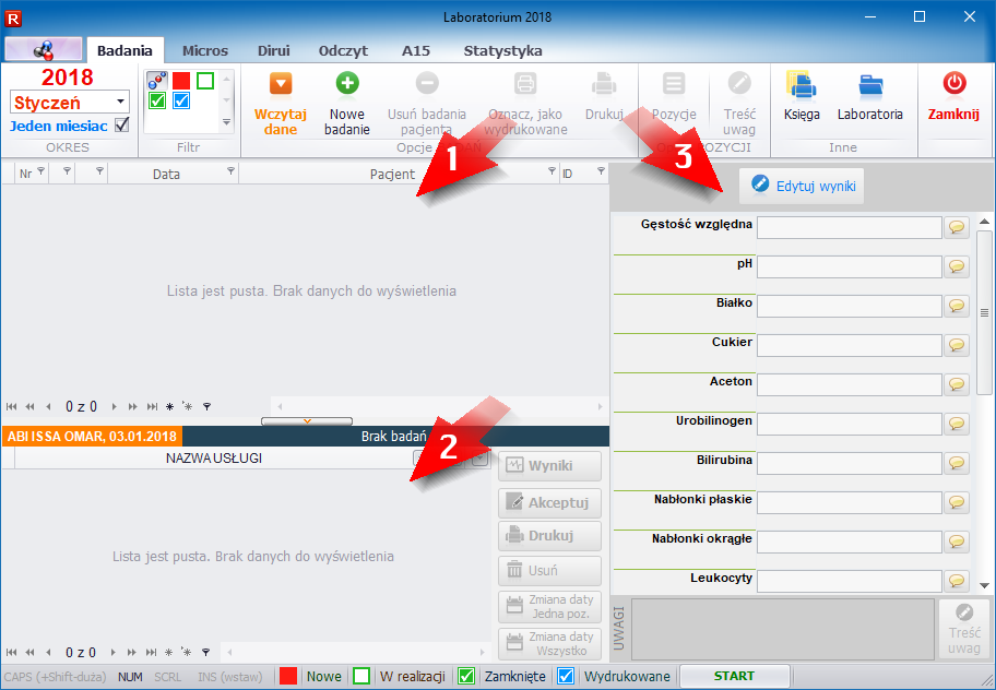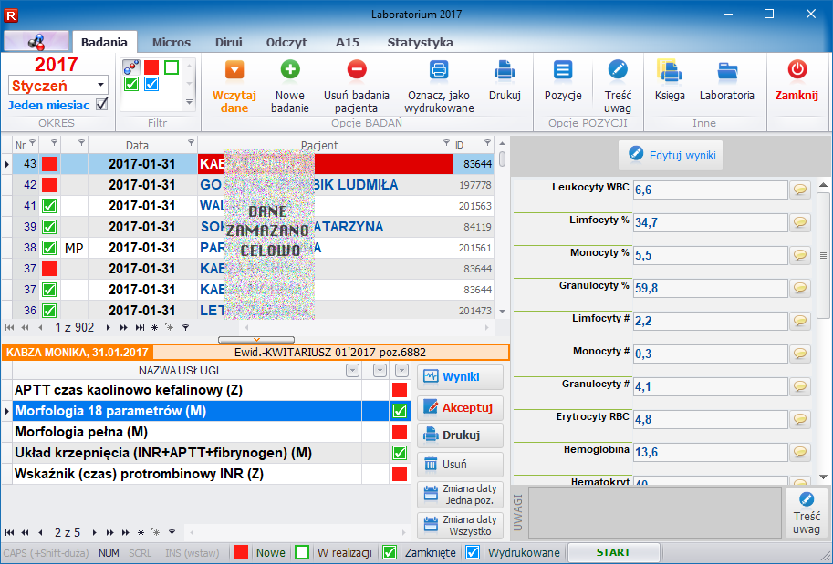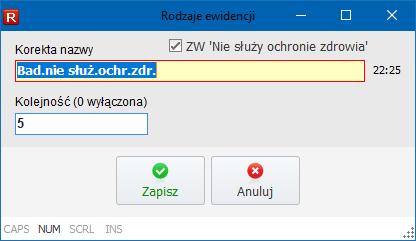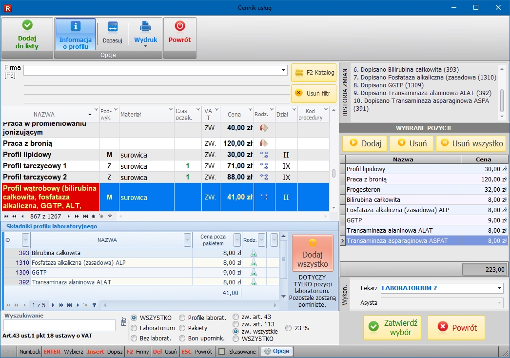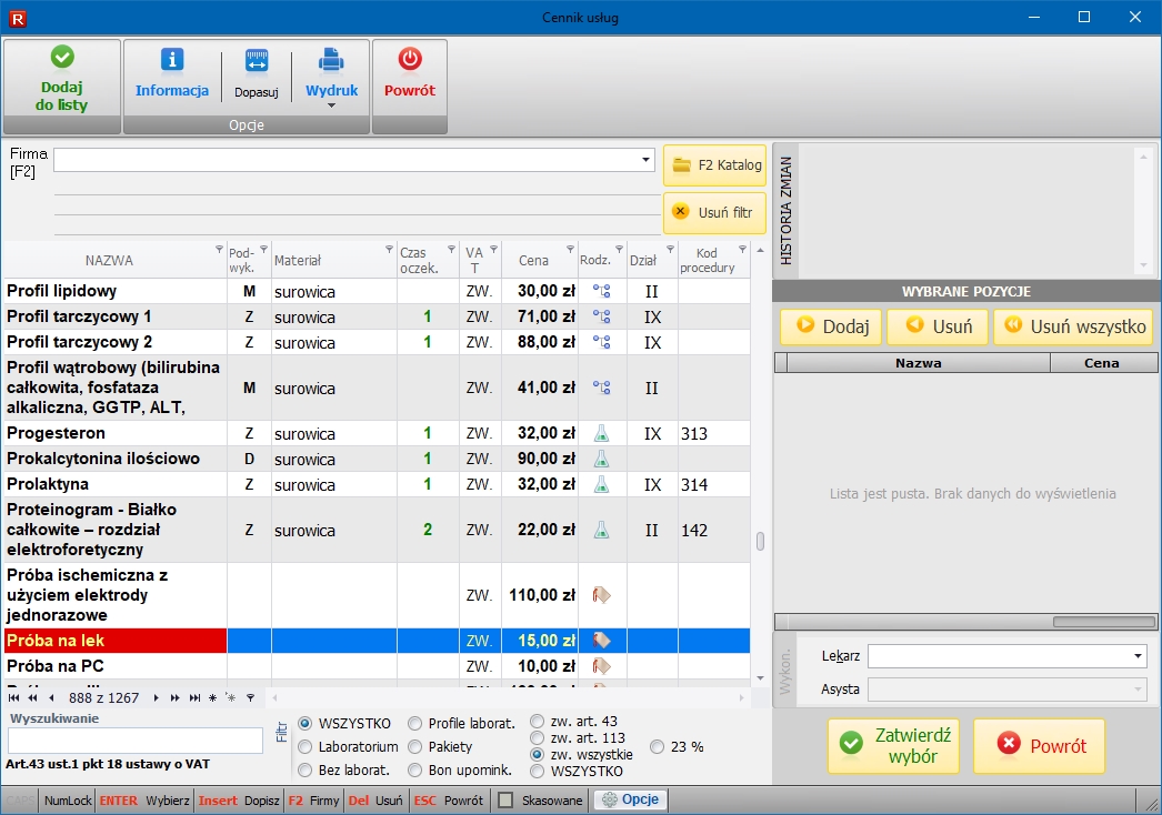 Dotychczas podczas wprowadzania danych do ewidencji medycznej (okno główne - opcja Ewidencja - Nowy lub Korekta) możliwość wybrania wielu pozycji cennika przy jednym zapisie dostępna była wyłącznie dla pozycji laboratoryjnych (Zlecenie laboratoryjne). Obecnie w tym sposobie edycji dostępny jest cały cennik. O ile w placówce jest laboratorium analityczne, to obecnie zlecenia tworzone są w niezmieniony sposób tj. pozycje, które nie są laboratoryjne pozostają tylko, jako element zestawu nie wchodząc do zlecenia laboratoryjnego. Dla wszystkich placówek medycznych (tych z własnym laboratorium i bez niego) nowa funkcjonalność spowoduje przyspieszenie obsługi pacjenta. Poniżej przedstawiono okno edycji pakietowej (okno główne - Ewidencja - Nowy lub Korekta - Zlecenie, zestaw). ![]() Jeśli podświetlenie cennika ustawione będzie na pozycji, która jest profilem laboratoryjnym, to możliwy jest wybór wszystkich pozycji składowych profilu opcją Dodaj wszystko. Pozycje składowe profilu wyświetlone są w panelu Składniki profilu laboratoryjnego. ![]() W opcji Laboratorium dotychczasowe elementy, dostępne w wyskakujących oknach obecnie zgrupowano na głównym. W obszarze wyników, w dolnej części okna dostępny jest panel uwag do zlecenia. ![]() Obszary okna Labroatorium ![]() Nowe okno Laboratorium Edycja wyniku jest możliwa bez dodatkowych czynności (o ile zlecenie nie posiada jeszcze akceptacji). ![]() Okna dialogowe zazwyczaj przejmują kontrolę w taki sposób, aby nie było możliwe edytowanie innych opcji. Możliwość jednoczesnej pracy na kilku opcjach głównych została w programie Rejestracja rozszerzona o Laboratorium. Obecnie w programie możliwe jest jednoczesne otwarcie okien opcji: Wróć do spisu Wróć na początek Zdjęto limit możliwych do zdefiniowania rodzajów ewidencji. O kolejności wyświetlania w ewidencji medycznej decyduje numer ustalany przez użytkownika. ![]() Wróć do spisu Wróć na początek |