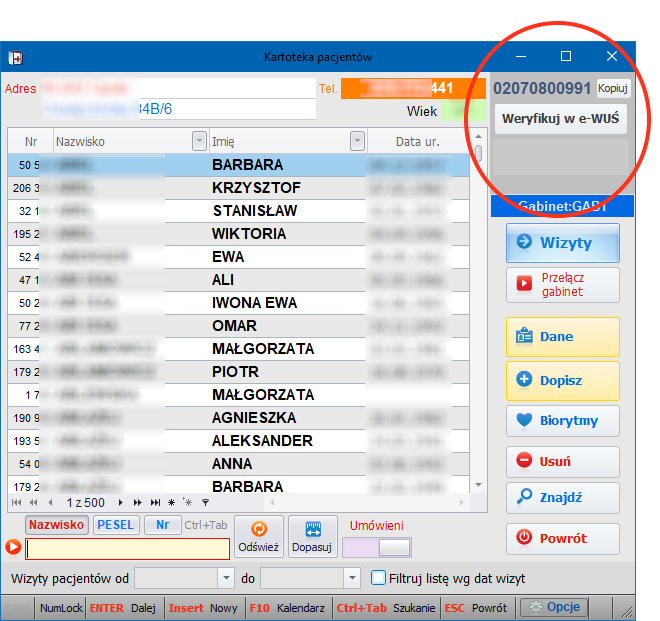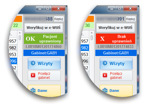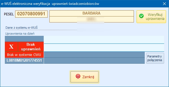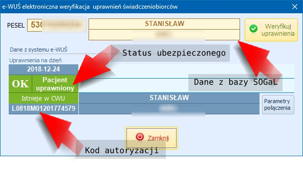 Wprowadzono możliwość weryfikacji uprawnień Pacjentów. Opcja weryfikacji w programie SOGaL dostępna jest z poziomu Kartoteki pacjentów - niezaleznie od miejsca w programie, w którym ją wywołano. ![]() W celu sprawdzenia uprawnień należy w Kartotece pacjentów wyszukać żądane nazwisko, następnie należy wybrać opcję Weryfikuj w e-WUŚ. Przeprowadzenie weryfikacji nie wymaga wprowadzania żadnych dodatkowych informacji. Wszystkie pobierane są z Kartoteki pacjentów oraz Parametrów połączenia. ![]() Opcja Weryfikuj uprawnienia służy powtórzeniu weryfikacji np. po wystąpieniu błędu połączenia z serwerem. W normalnym trybie nie ma potrzeby jej uruchamiania. ![]() Dane autoryzowane są na wskazaną datę, stąd ich dostępność w oknie kartoteki pacjentów również wyświetlana jest tylko w dniu jej dokonania: