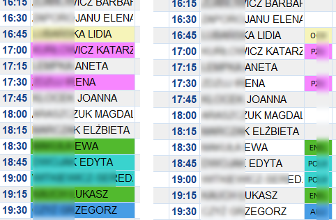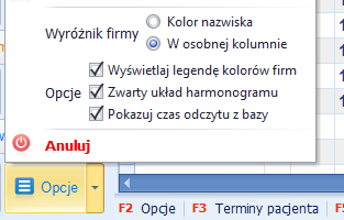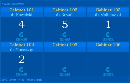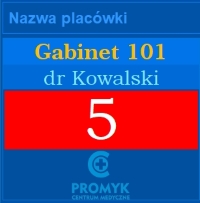 Podczas rozliczania bonów lub kuponów podarunkowych (Ewidencja -> Nowy -> Rozlicz bon -> Sprawdź kod -> Rozpocznij rozliczanie -> Zlecenie, zestaw)wprowadzono kontrolę pozycji zrealizowanych i już wybranych. ![]() Każda wybrana pozycja oznaczana jest na czerwono (nie tylko te, wybrane w częściowej realizacji wcześniejszej). Zmiana oznaczenia działa na bieżąco i uwzględnia również wycofywanie pozycji w oknie Zlecenie, zestaw. Pozycje już wybrane można dodać ponownie (powielić) dopiero po dwukrotnym potwierdzeniu (nie można teraz przez przypadek dodać np. dwóch tych samych konsultacji). ![]() System kolejkowy Przywoływanie pacjentów odbywa się z poziomu gabinetu lekarskiego (program SOGaL). Lekarz ma do dyspozycji listę pacjentów, której zawartość określana jest w harmonogramie programu Rejestracja. O momencie przywołania dowolnego pacjenta z listy decyduje lekarz. Z chwilą wywołania numeru pacjenta, informacja ta wyświetlana jest na ekranach w poczekalni. System można zbudować w oparciu o wolno stojący komputer przyłączony do sieci lub z wykorzystaniem komputera Rejestracji, do którego podłączone są wówczas dwa monitory, z których jeden odpowiada za wyświetlanie informacji dla pacjentów. ![]() Na monitorach poczekalni wyświetlana jest informacja z powyższej ilustracji. Elementy systemu kolejkowego • Program Rejestracja - opcja Harmonogram • Program gabinetowy SOGaL - lista pacjentów • Monitor(y) w poczekalni - przez ustalony czas numer ten wyświetla się na czerwono. ![]() • Program sterujący - dodatkowy program do obsługi monitorów. W programie sterującym dostępne są następujące ustawienia: UWAGA! I jeśli z dowolnych przyczyn konieczna jest zmiana pomieszczenia (gabinetu), to system rozpozna ten fakt poprzez wejście lekarza do programu SOGaL w zmienionym miejscu. Z chwilą wylogowania lekarza z programu informacja z aktywnej przechodzi w wyłączoną (jak na ilustracji gabinet 105 i 106) Harmonogram | Oznaczenia kolorami W Harmonogramie wprowadzono możliwość przełączania sposobu oznaczania pacjentów, którzy obsługiwani są na zlecenie firm. ![]() Wyróżnik firmy: Kolor nazwiska - całe pole nazwiska jest oznaczone kolorem danej firmy. Wyróżnik firmy: W osobnej kolumnie - oznaczenie kolorem wykorzystane jest tylko w kolumnie z oznaczeniem firmy. Wyświetlaj legendę kolorów firm - powoduje wyświetlenie wszystkich skrótów i kolorów wyróżnionych firm w ostatniej linii okna (linia statusu). ![]() |