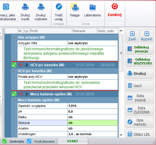 W najnowsze wersji programu Rejestracja wszystkie wyniki badań, bez względu, czy są to badania pojedyncze, profile, czy pakiety, zebrane zostały do jednego obszaru, w którym edycja odbywa się bez dodatkowych potwierdzeń, a zapis dokonuje się automatycznie. Obecnie nie ma konieczności zamykania całego zlecenia. Zablokowanie pozycji do edycji możliwe jest obecnie dla każdego badania z listy zleconych pacjentowi. Odświeżanie wyników po odczytach z analizatorów podłączonych do systemu odbywa się bez konieczności ponownego wyszukiwania pacjenta z listy. ![]() |