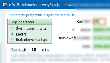 Z powodu różnic w logowaniu do systemu e-Wuś, w zależności od regionu Polski, wprowadzono stosowną zmianę w danych logowania. ► Oddziały NFZ, dla których w parametrach należy wskazać opcję Świadczeniodawca lub Lekarz (wymagane jest wówczas pole Kod lekarza) 04 Lubuski ► Oddziały NFZ, które przy logowaniu do e-WUŚ wymagają tylko loginu i hasła (ustawienie w parametrach: Brak określenia typu): 01 Dolnośląski W oknie opcji Kartoteka pacjentów -> Weryfikuj w e-WUŚ -> Parametry połączenia wprowadzono nową pozycję Brak określenia typu. ![]() |